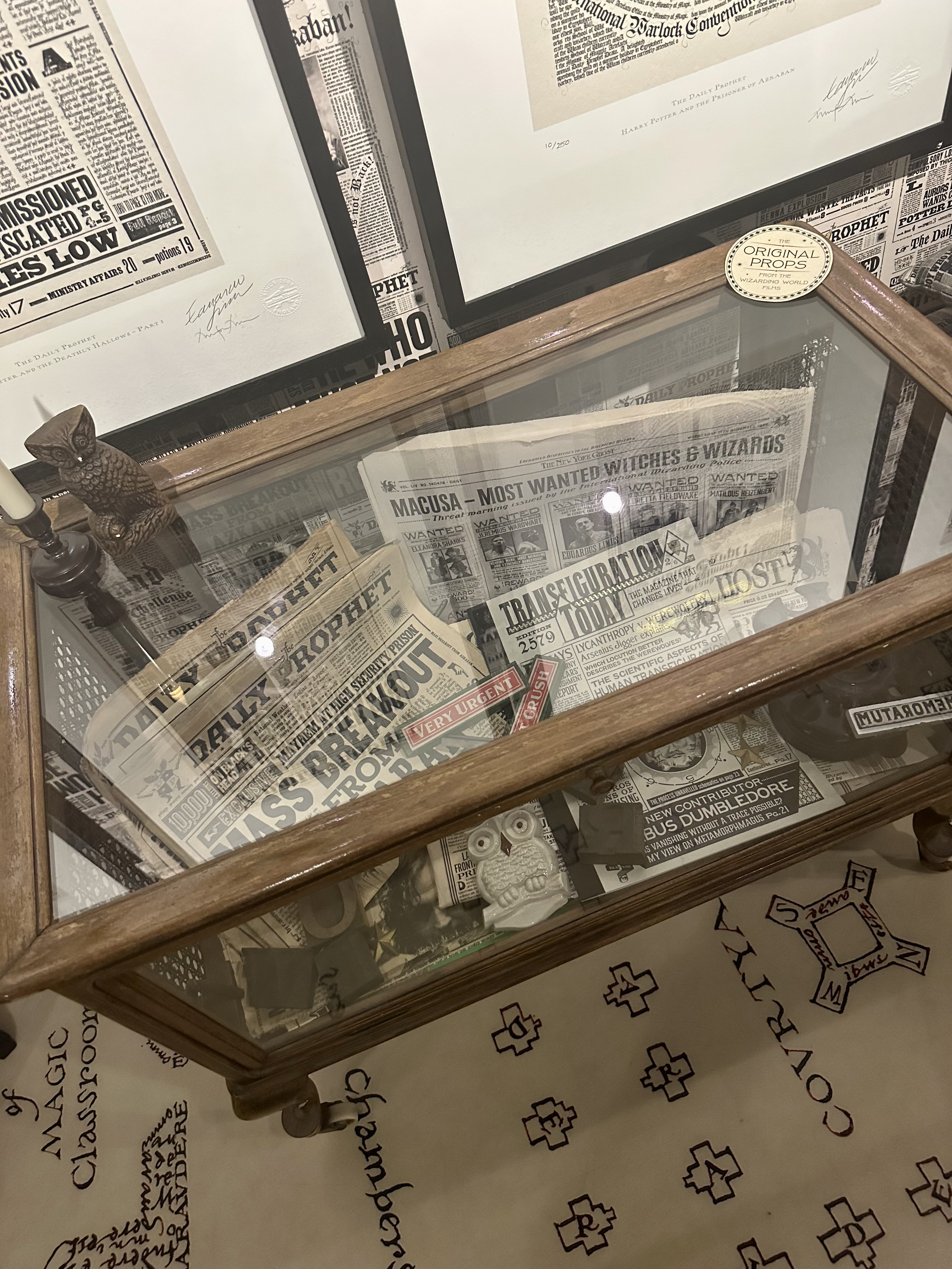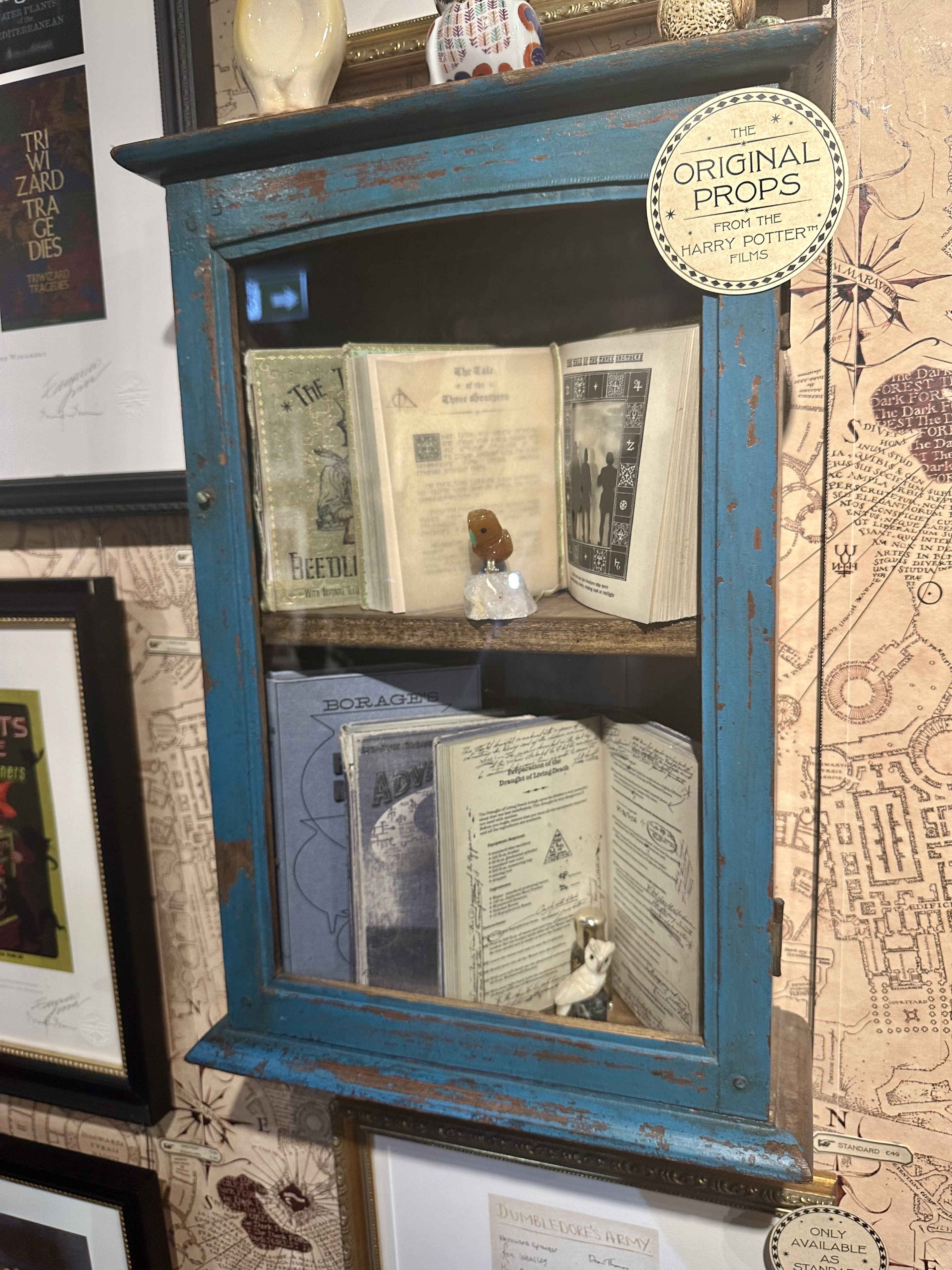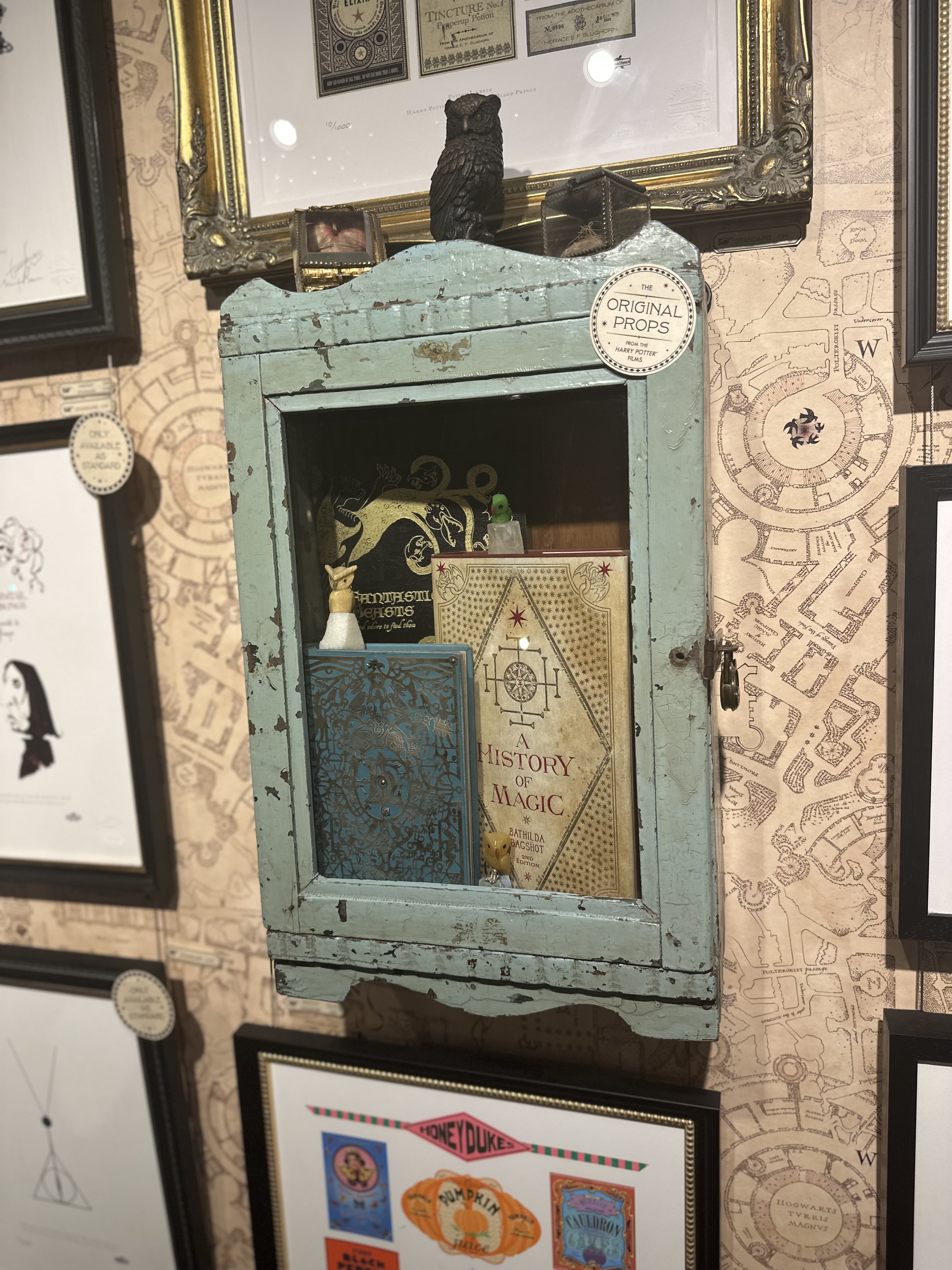 - House of Minalima – This has been on my list of “must sees” and I’m so glad I went! The shop is very small, but packed with everything Harry Potter as this was the design team behind illustrations and artwork of the books and films. The Black Family wallpaper was prominent as were several copies of the Quibbler, Daily Prophet and all of the Hogwarts required reading. If only I had more room in my luggage, the amount of things I would’ve bought! (I love that wallpaper!) What a treat to see so many props from the different films (including the Fantastic Beast franchise)!