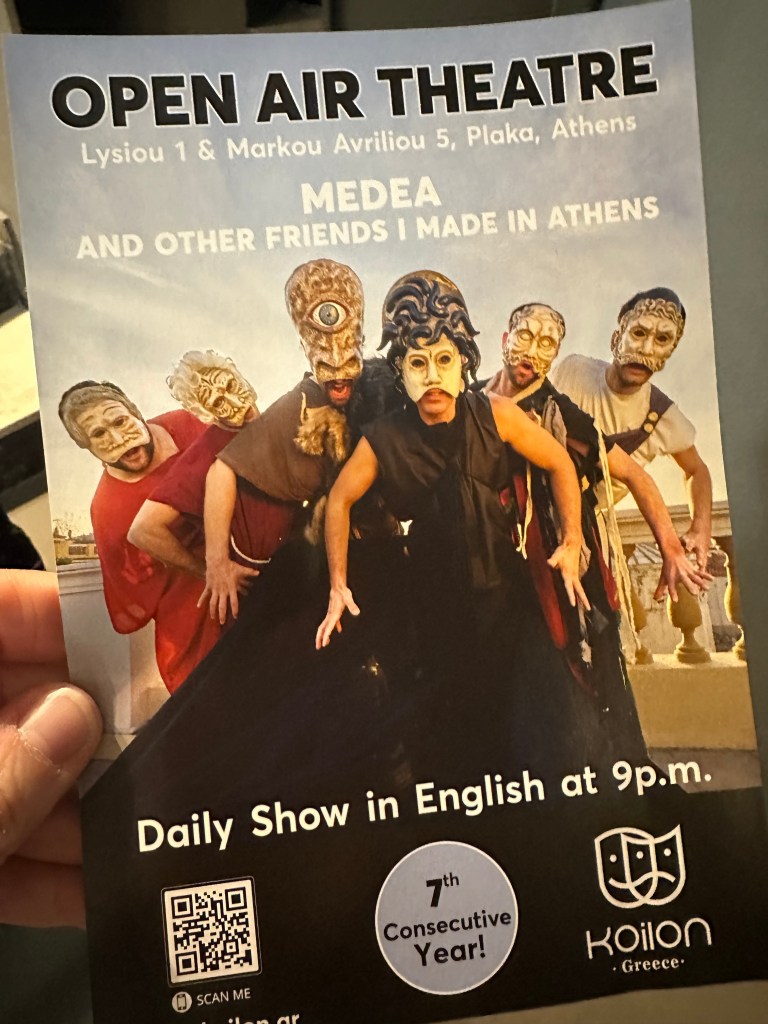 - Greek Theatre with Koilon Productions – While in the birthplace of theatre, seeing a live production based on Greek classics was high on my list. The play “Medea and Other Friends I Made in Athens” compiles excerpts from the following major works of Ancient Greek literature, in order of presentation: