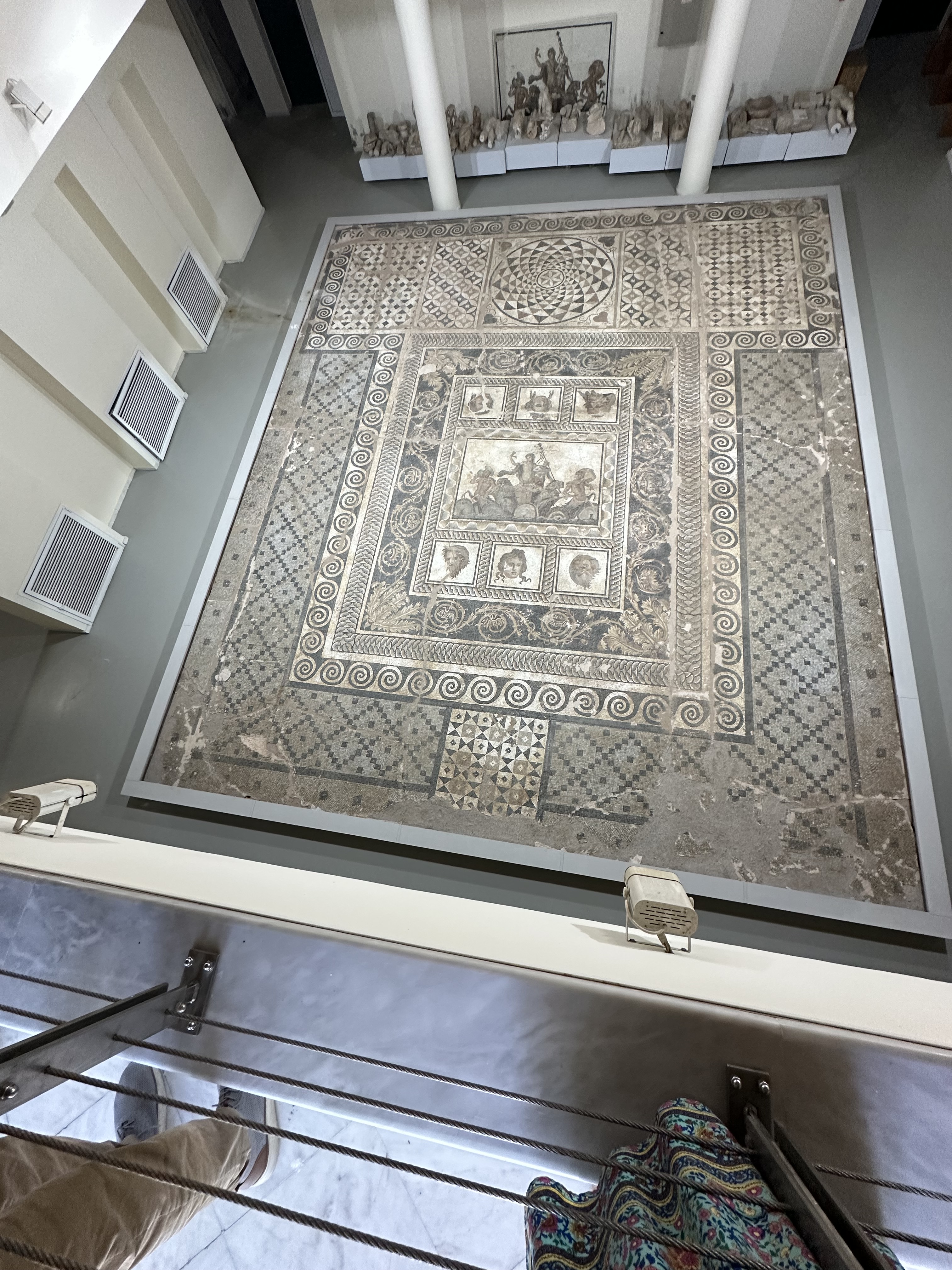 - Village of Dion – Here, we visited with the owner of a small, family owned taverna. Placed our orders for fresh octopus, moussaka, Greek salads, Greek sausage and Bouyourdi. Adjacent to the restaurant was a small archeological museum that housed a massive mosaic portraying Dionysus and his Satires.