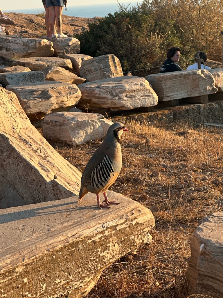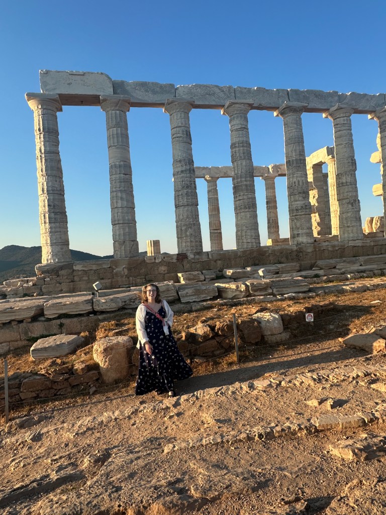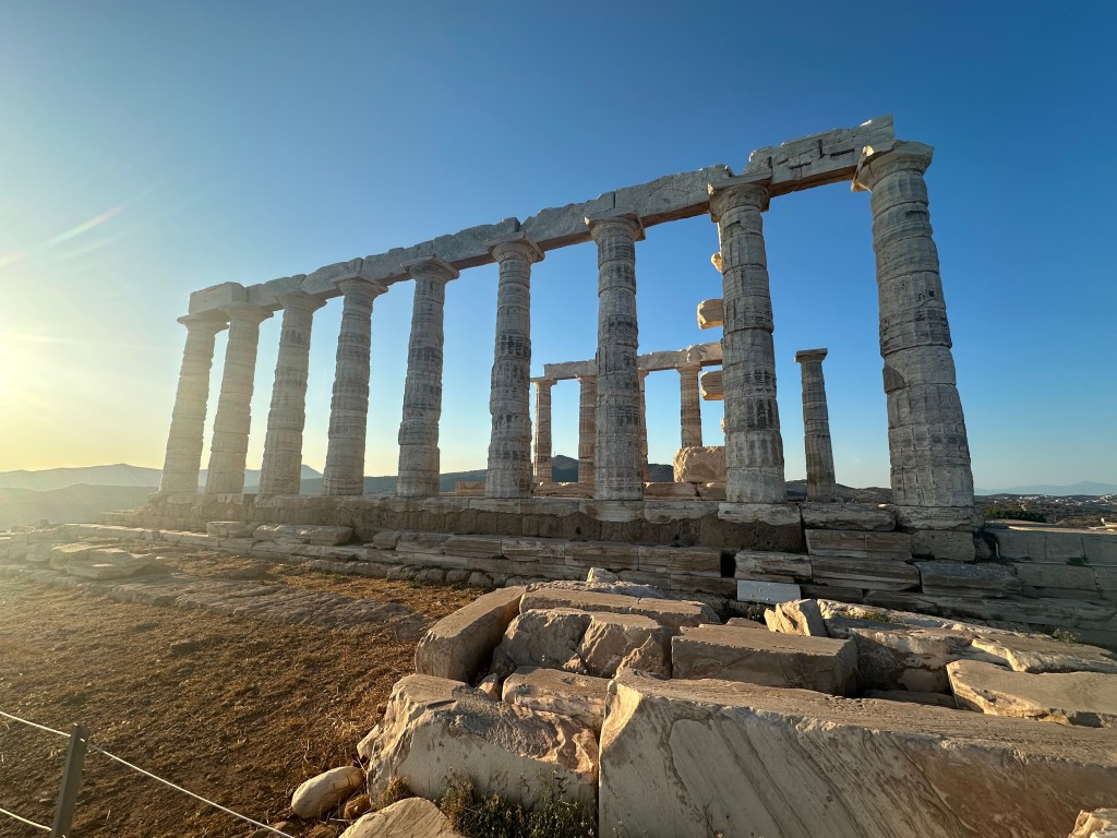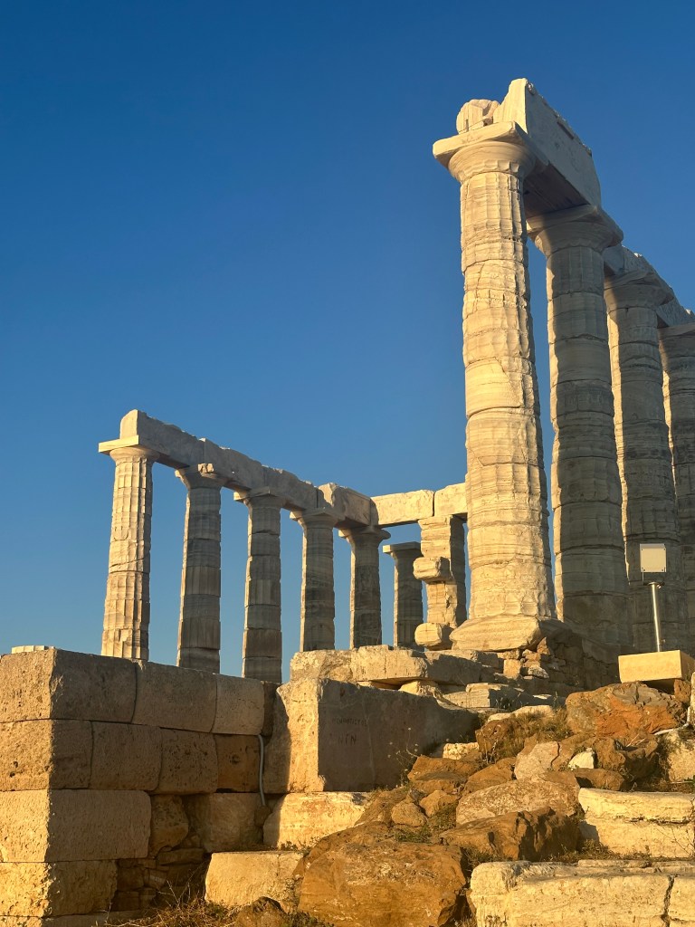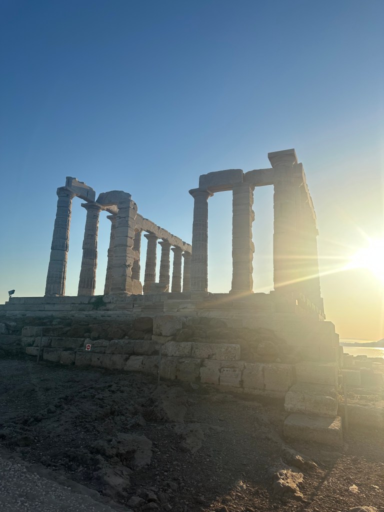 ACT III – Journey to Sounion and the Temple of Poseidon. Sounion is approximately 65 km from our base in Plaka. I’d booked a car to drive us there because the bus would take over 3 hours. After our long train journey to Mount Olympus, that was a no go. Speaking of cars, I’ve found the app FreeNow very handy. It directly connects you with local taxi drivers and is much cheaper than Uber (which is also an option). Our ride took about 1.25 hrs but it was time well spent watching the landscape which mesmerizes me. Our goal was to reach the Temple at sunset (because that’s what was recommended). WOW. Surrounded by the Sounion harbor and Aegean Sea, this site was breathtaking. So, so peaceful. We ate at the adjacent restaurant and had a ride booked for the journey back.
