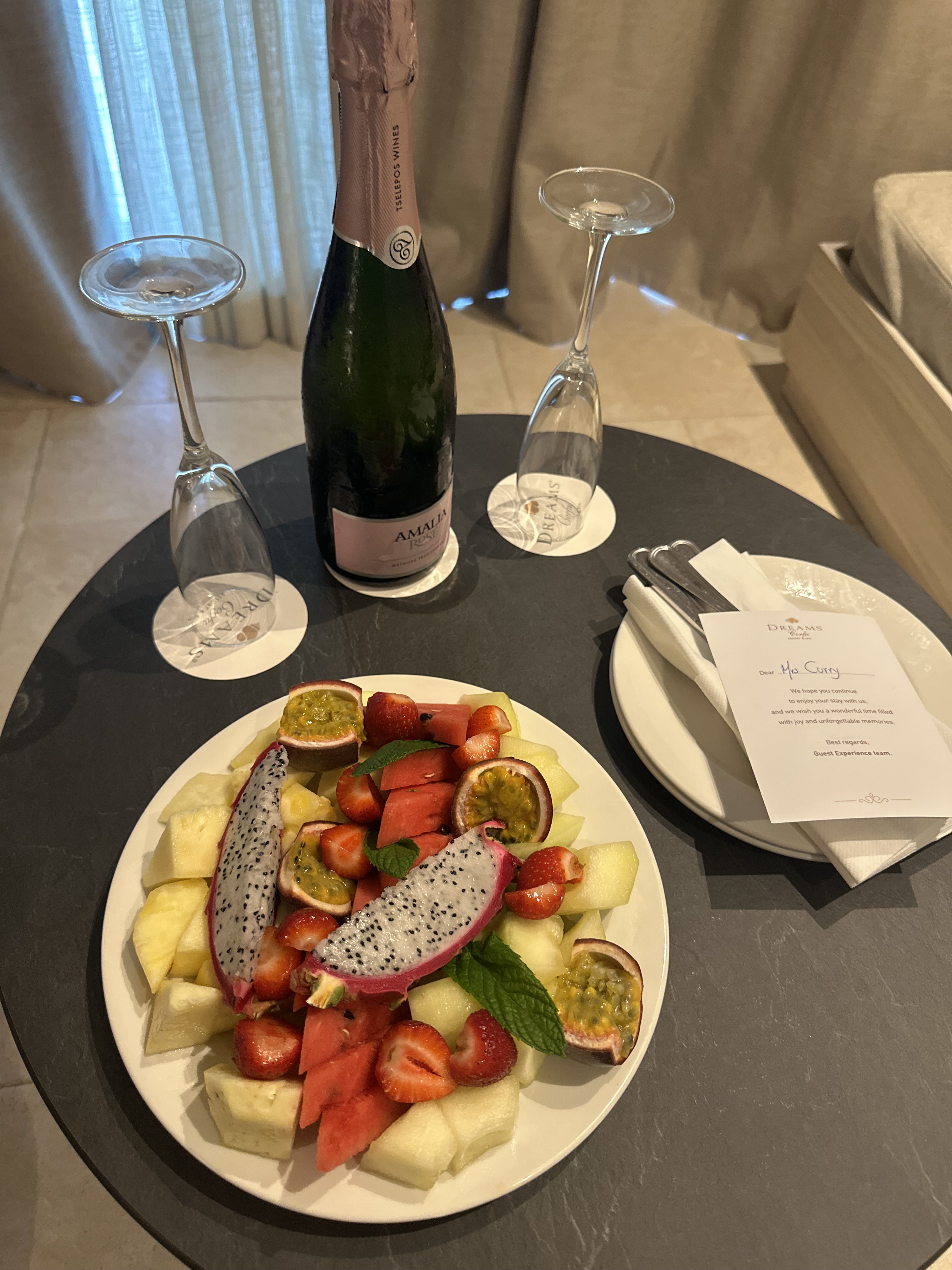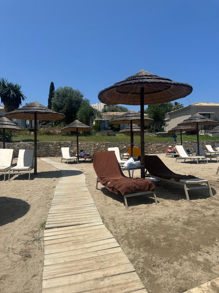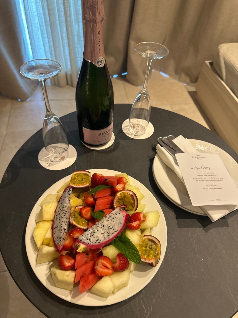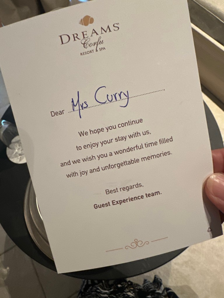 I’m giving high marks to Dreams Corfu Resort & Spa, specifically to Vicky Lintovoy and her team at Guest Experiences! We arrived after 11PM on Sunday evening, tired and hungry. If you read yesterday’s entry, you know the issue we had with our Sky Express flight. Our nerves were already shot. Upon arrival at Dreams, we were greeted warmly and given welcome Prosecco. They were still serving a light snack in their main restaurant, so we got a quick bite, but were ready to crash. Again, we zipped around but this time on a resort golf cart and taken to our bungalow. Welp….there was a lovely combo of tiredness, stress, lingering hunger and overall menopausal rage bubbling when the first impression of our room was….not.so.great. The perfect storm for my inner Karen to emerge. (Sorry, Mom, not you.) I voiced my concerns to reception and sent a message to property management.