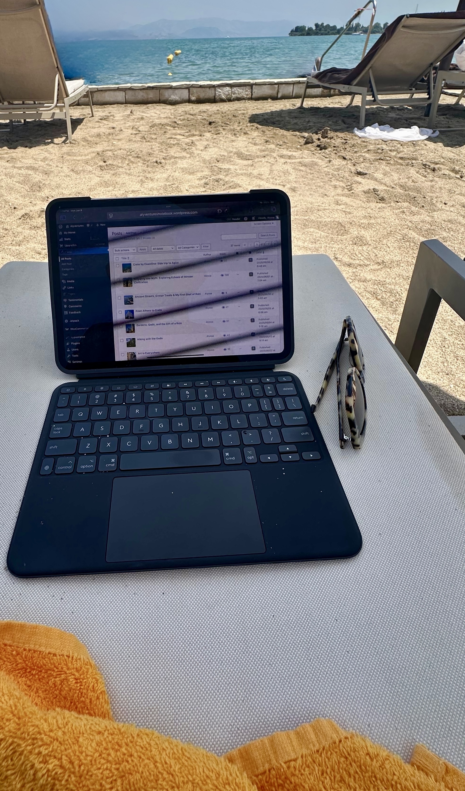 Thanks to Billy and Sluta Leta Car Rentals in Gouvia, I have the use of a slick, compact Kia Picanto complete with automatic transmission, Apple CarPlay, rear backup camera and, most importantly, air conditioning! Yay!